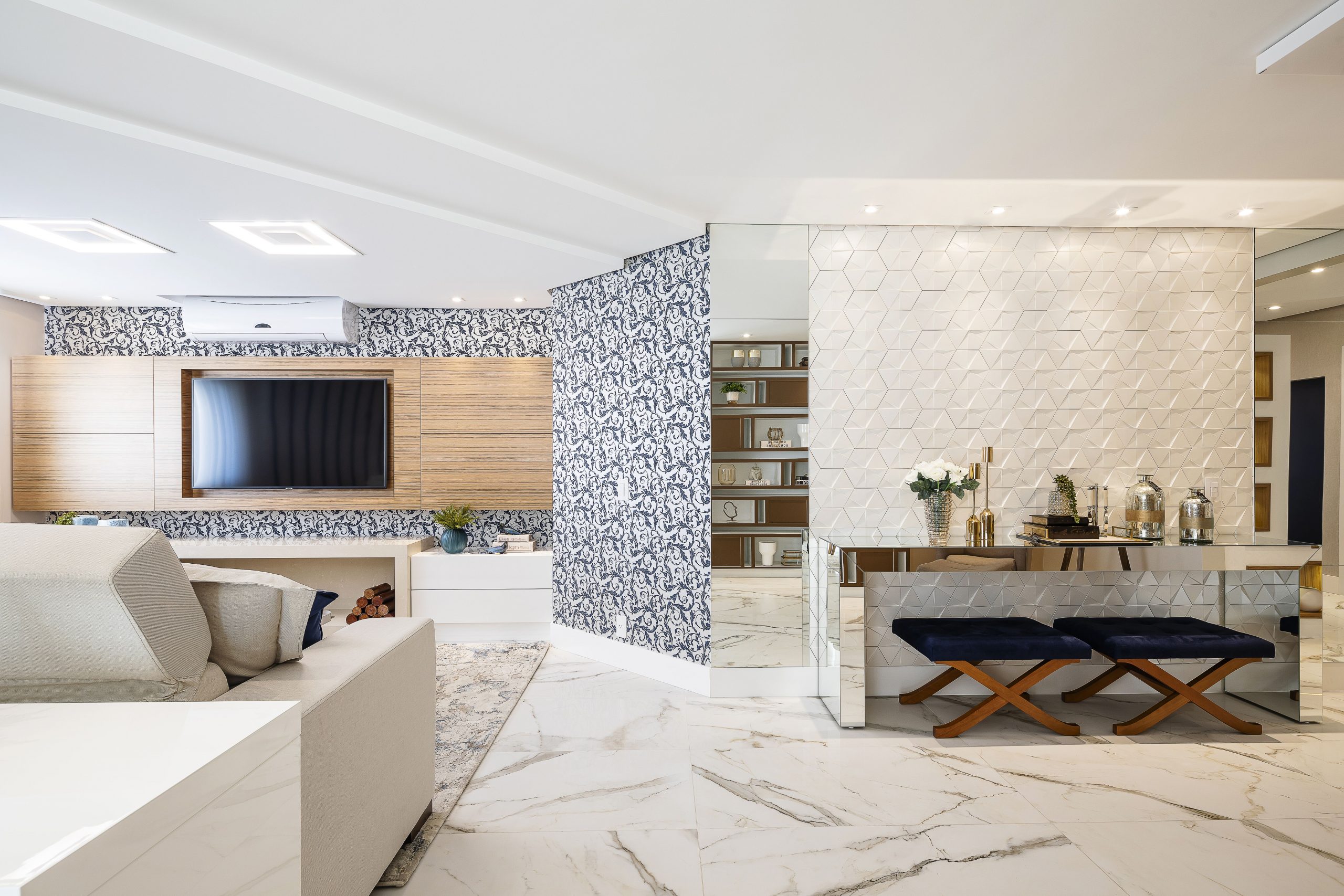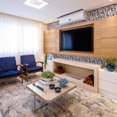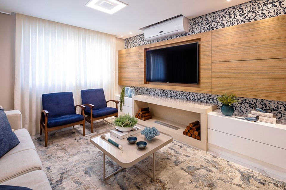 Na sala de estar o paleta de azuis dão harmonia ao ambiente. Quem assina o projeto é nossa parceira Design Daiana Oliboni e a decor ficou por conta da Cristiane Marcante Decoração.