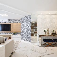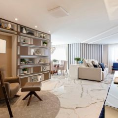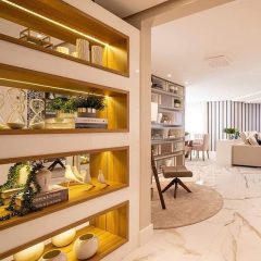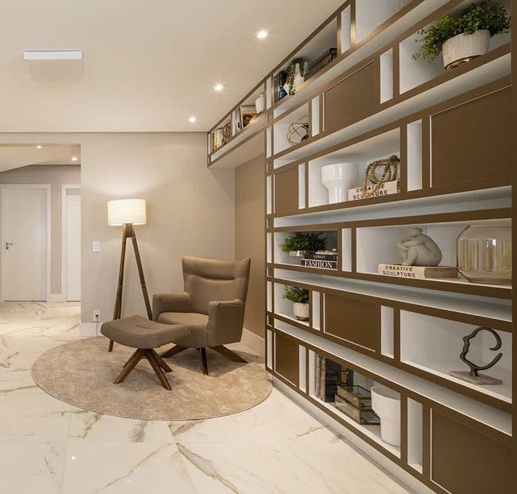 Um lar aconchegante reflete o estilo de vida e a personalidade dos moradores, para este apartamento foi criado um espaço de leitura dedicado ao conforto e relaxamento. A estante com pintura em laca e nichos assimétricos compõem o ambiente, e possibilita os moradores guardarem lembranças, objetos de decoração e ainda deixar os livros expostos.