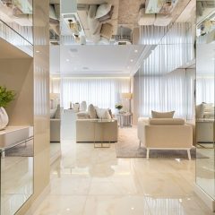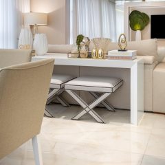 Os tons de dourados forma predominantes para aquecer o ambiente, e foram complementados com cristais muranos que deram um toque de luxo em cada detalhe.