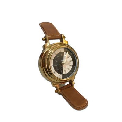 Relógio de mesa redondo dourado com detalhes em couro