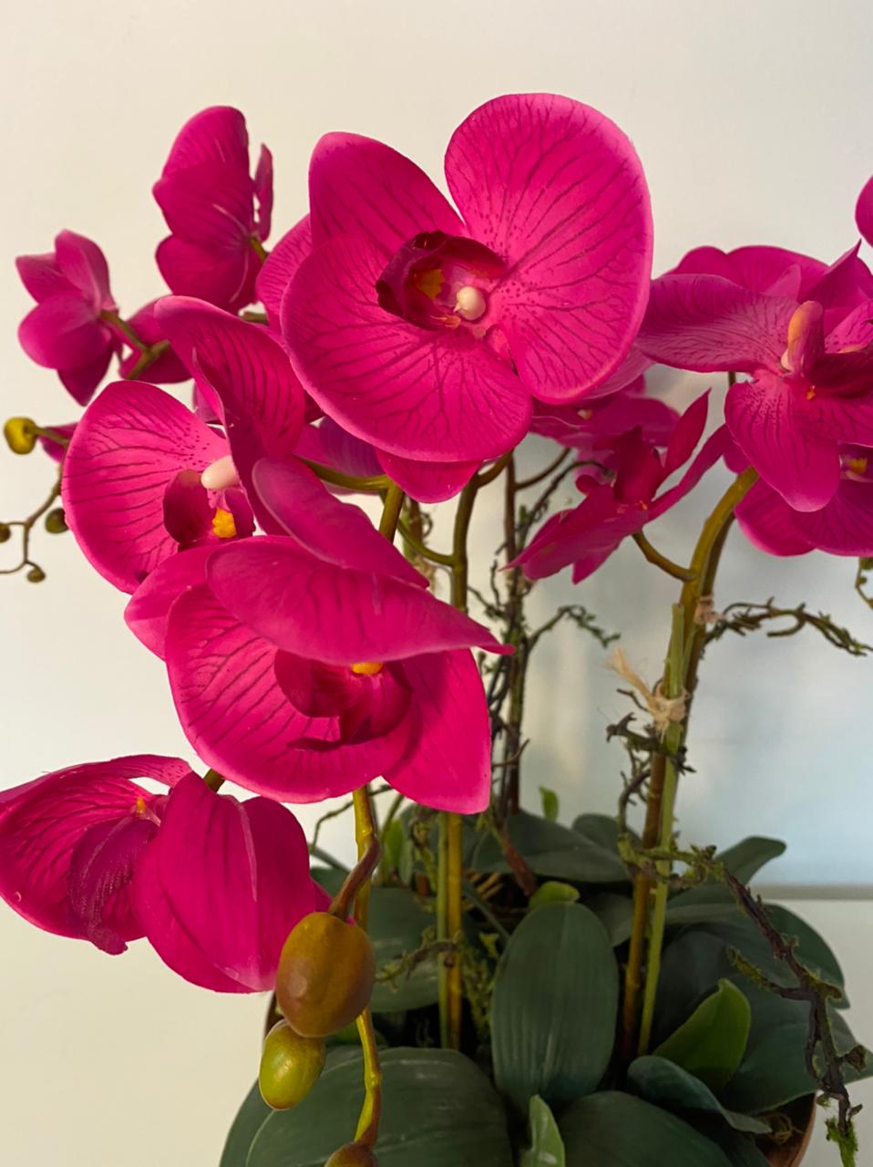 Arranjo floral de orquídeas rosas, em vaso de metal rose gold.